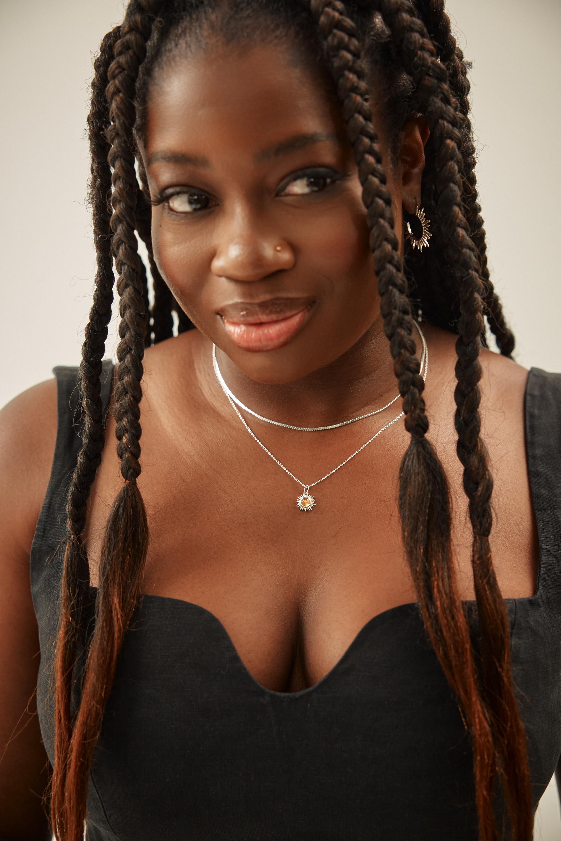This latest collaboration with Amfo feels particularly personal. “I knew I wanted yellow and some kind of sun design,” says Amfo. “I want my necklace to represent warmth and of course love”. The final design features a central citrine stone—known for its warmth and glow—surrounded by beaded details in red, green, yellow and black, a colour story that reflects Clara’s Ghanaian roots. “I love the colour combo of the Ghanaian flag, so I had to incorporate them in the accompanying beads,” she adds.
