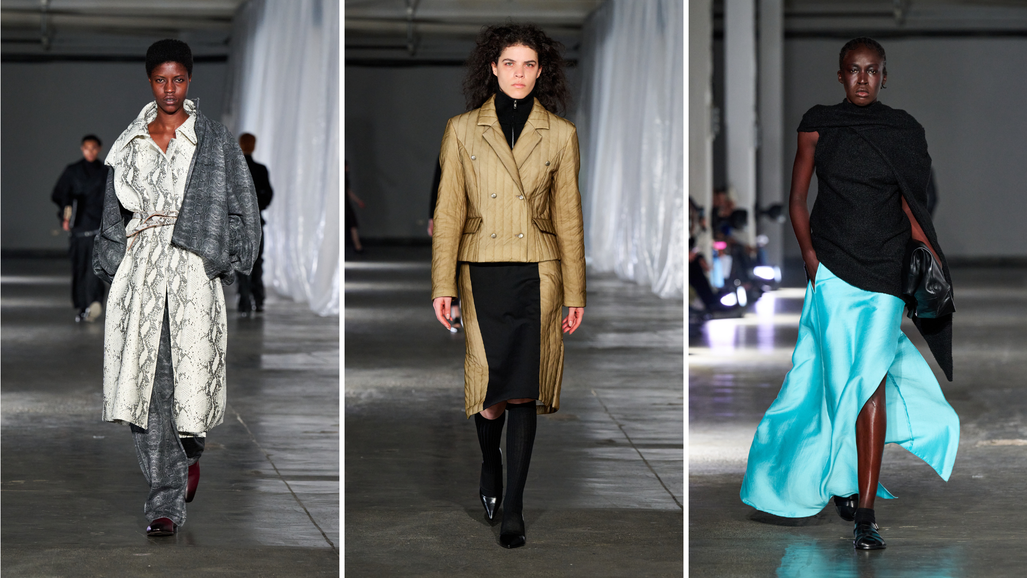 As guests took their seats opposite a backdrop of transparent plastic, the three designers presented their respective collections.