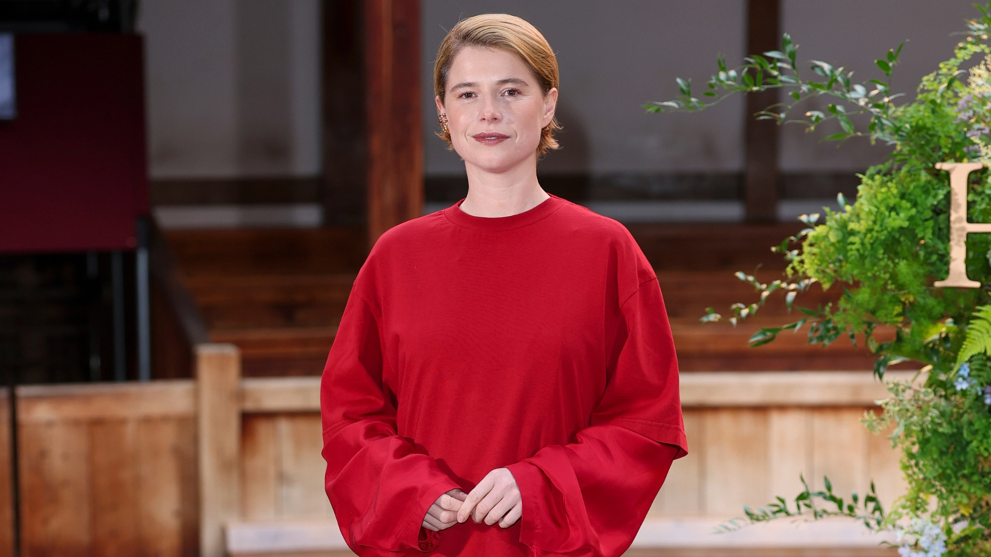 For a rather fitting photocall at Shakespeare's Globe, Buckley wore stylishly loose separates the colour of Christmas, aka a rich cranberry that, really, is an excellent shade to wear all-year round but gets an especially good showing in December.