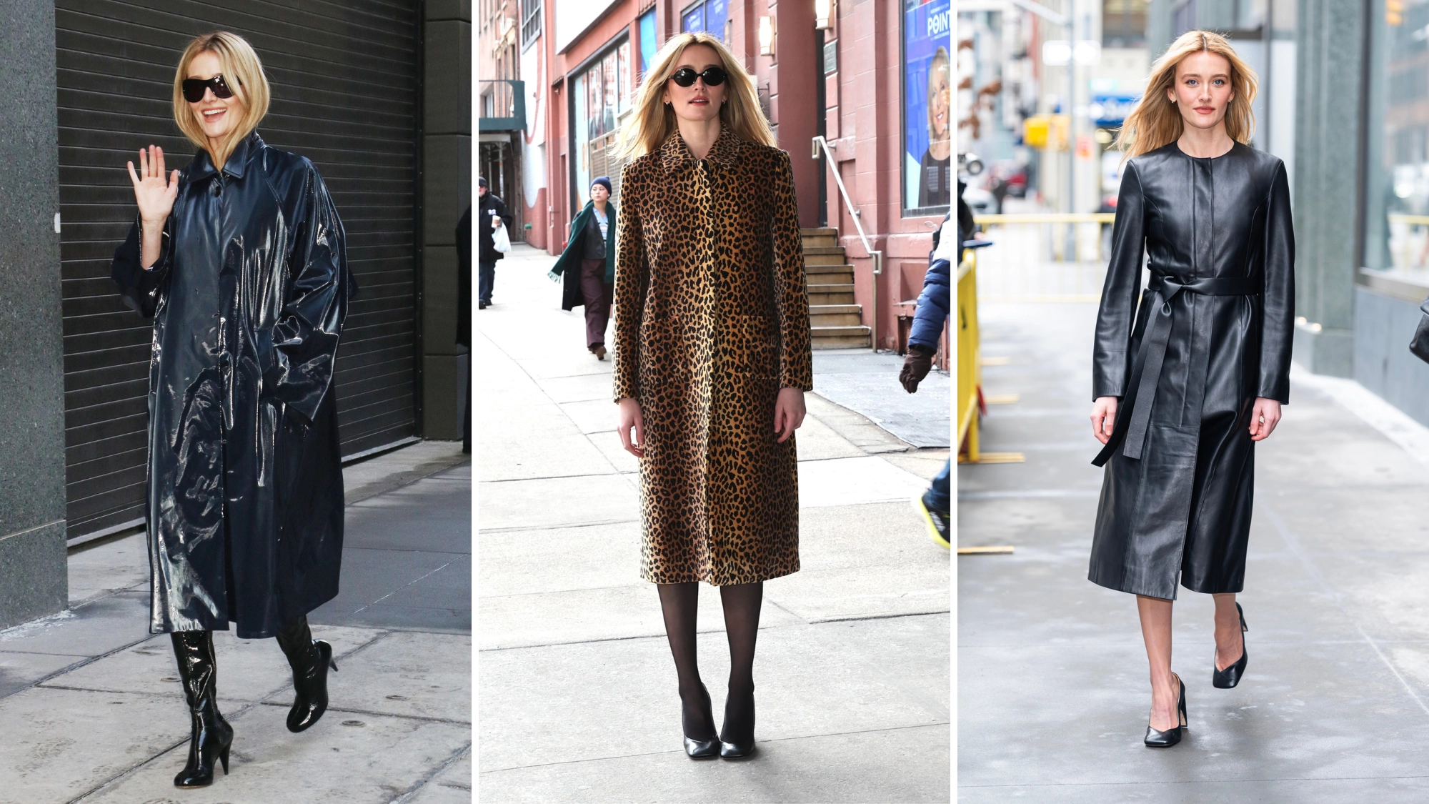 This uniform could be summed up as follows: sunglasses, statement coat, Chanel pumps. It's as simple as that and, actually, with temperatures finally gaining a hint of balminess as we edge closer to Spring, it's a formula you can easily copy (just wear something light underneath and send your coats off in style). Spotted outside CBS, Pidgeon appeared wearing a leopard-print coat, buttoned to her chin, black tights (perfectly-pitched between opaque and sheer) and those angular pumps, a hangover perhaps from spending a season as CBK. Up next, a wet-look mac, hair tucked into its half-popped collar, with cone-heeled, knee-high boots.