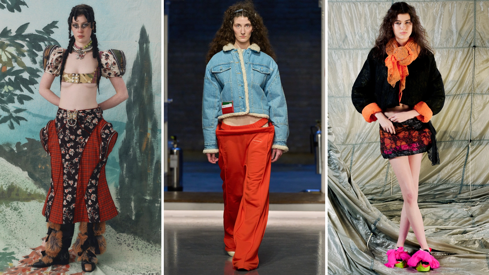 Stepping into the golf-themed world of Chopova Lowena, abuzz with playfully dressed regency core mannequins, you felt compelled to find your main character in the room. The collection was a beautiful mix of craftsmanship and sophisticated fabric parings; tartans mixed with florals, Argyle and camoflague, beaded cotton dresses and faux fur booties, low-rise boned zip skirts and corsets in cotton chintz. The elevated collection is born from upcycled deadstock, redefining the remnants of past seasons. The cat knit jumper and boned tulle skirt accesorised with a cat-shaped bag and bonnet is currently living rent-free in my head.