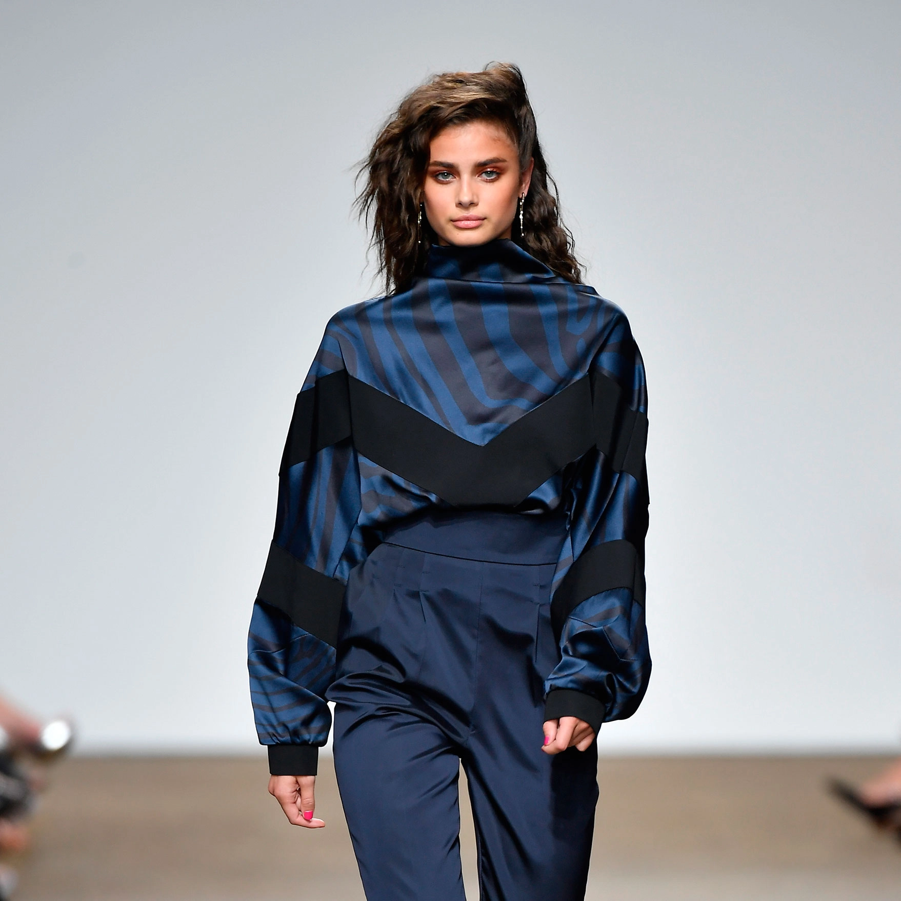 Current campaign girl Taylor Hill kicked things off, wearing what was later revealed to be one of the 31 items now for sale: a silky, funnel neck blouse in an 80s windbreaker silhouette with a navy and black zebra print and chevron pattern, which at £145 is sure to be a speedy sell-out. Faces-of-the-moment Lineisy Montero and Stella Maxwell were quick to follow in various iterations of the club kids collection.