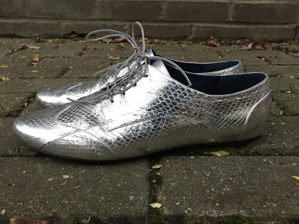 The result: For this pair, I went for the classic Oxford style. I was really tempted to mix different colours and fabrics, and I was so close to doing black and white… or gold and white… or leopard print hair. (Seriously, it’s really difficult to choose.) But in the end I chose the shiny silver snakeskin for my material, with matching silver laces and dark blue soft leather for the interior. I received them in about three weeks and couldn’t wait to take them out for a stroll. They’re comfortable, fun and surprisingly versatile.
