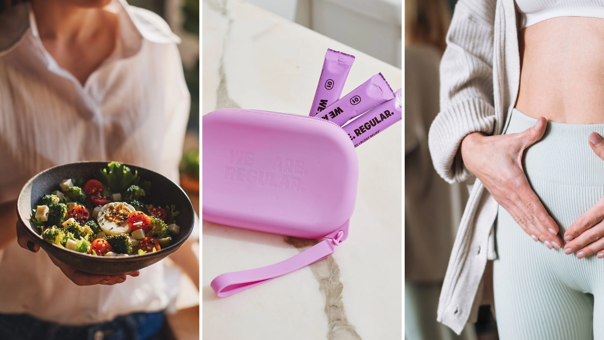 composite of a healthy bowl of food, WE ARE. REGULAR supplement sachets, and a bloated woman holding her stomach