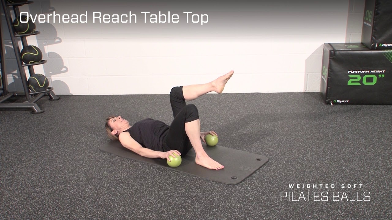 How? Lie on your back in the double tabletop position. Keeping your spine in neutral, exhale as you reach your arms up overhead as far as you can keeping your back on the mat and your legs in double table top. To deepen this exercise, place a Pilates ball between your knees and a weight (or weights) in your hands + squeeze the ball as your arms go overhead.