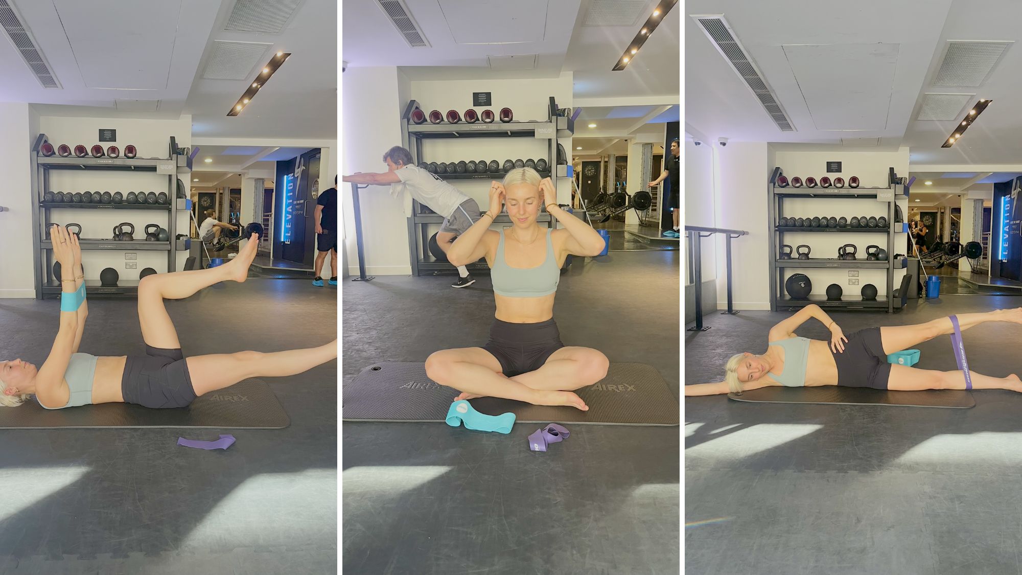By day four, I’m ready for a full-body session. Thursdays are usually my Reformer Pilates day, so I’m curious to see whether resistance bands can replicate that studio experience. I search YouTube and come across a banded Reformer-style class from The Glow Method. There’s just one issue: it calls for a flex band, which is different from the looped bands I’ve been using. Luckily, a friend has one I can borrow.