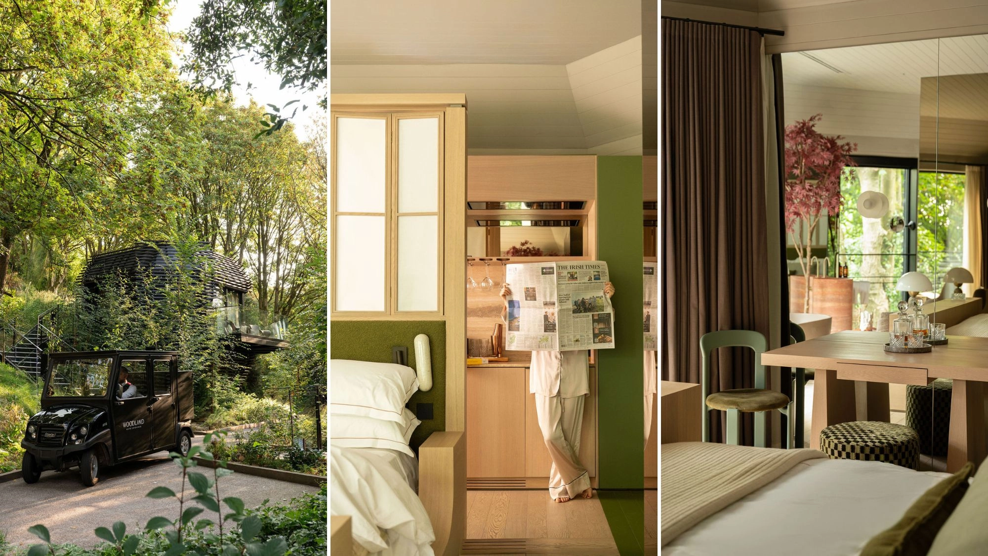All that faded away the moment I made it to the relative tranquility of The Clubhouse. I was to stay in one of the smartly designed woodland suites that are scattered—aptly—along the forest floor surrounding the main estate. [Insert info on when they were designed.] This meant my guest and I could breakfast—should we choose—away from the hoi polloi of the main hotel in our own glassy retreat overlooking the [insert the river in Cork].